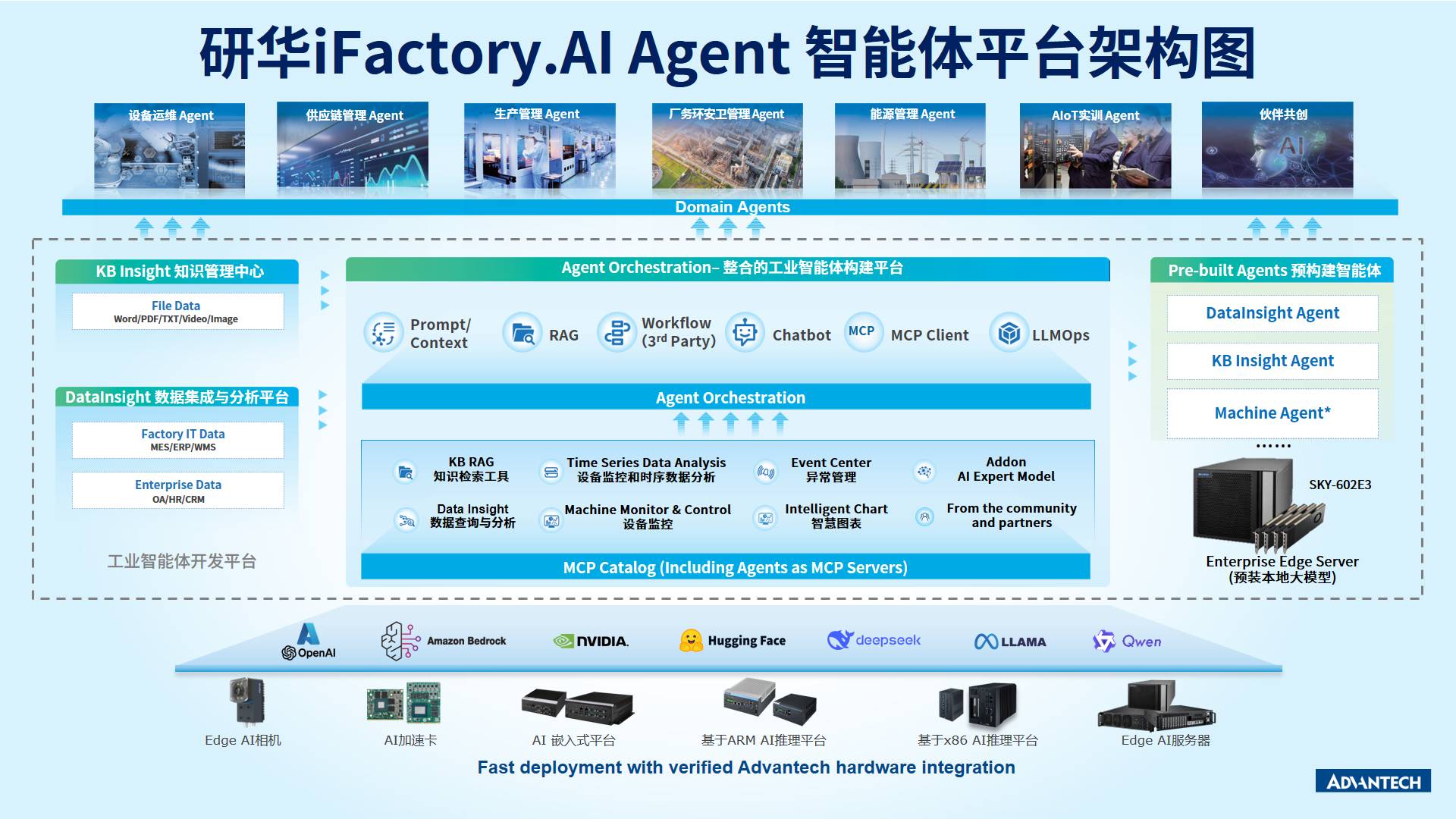 研华 iFactory.AI Agent 是研华自主研发的专为制造企业打造的工业级 AI Agent 平台,以工业数据、AIoT工具与企业知识为核心基座,提供 MCP Catalog、AI Agent 编排服务以及 Pre-built Agents(预构建智能体)。平台通过构建工业数据湖、指标智能洞察引擎和智能知识管理平台,深度集成多种 AIoT MCP Servers,全面支撑设备智慧运维、数据智能分析、企业知识问答等场景化Agent。基于该平台,制造企业可高效实现从数据感知、分析洞察到智能决策与执行的闭环管理,低门槛构建并落地专属的 AI Agent 解决方案,真正将大模型和工具能力转化为企业的生产力。