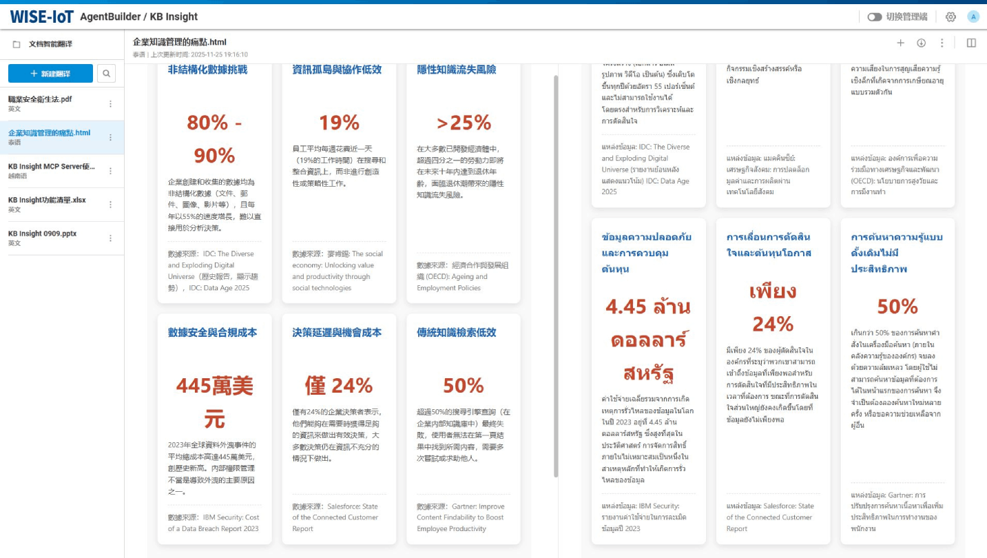 研华 iFactory.AI Agent 通过构建多语言专属知识中枢,支持中、英、泰、越南等语种的 Docx、PPTX、PDF、XlSX 文件智能翻译,并最大程度保留原始排版与格式,确保阅读体验一致。同时,平台可定制专业术语库,大幅提升技术内容的翻译准确率。实施后,海外工厂技术手册同步效率提升 70%,新厂投产周期缩短 30%。未来还可扩展至全球合规文件管理与多语言培训体系建设,真正实现知识无国界流动。