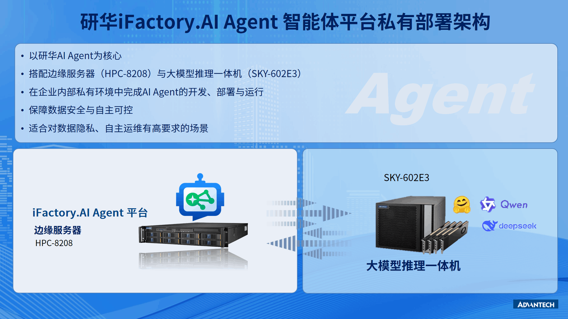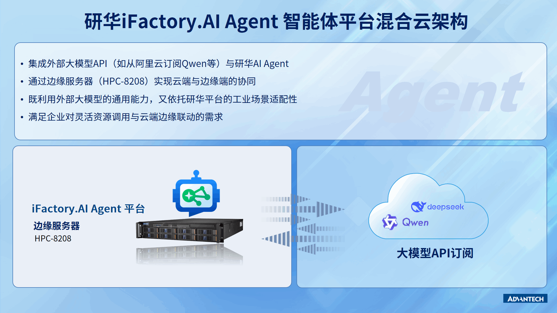 在混合云架构中,企业可通过订阅 OpenAI、Qwen、DeepSeek 等主流大模型 API,结合私有部署的研华 iFactory.AI Agent 平台,通过研华边缘服务器(HPC-8208)实现云端与边缘端的协同,实现“通用大模型能力 + 工业场景深度适配”的协同优势。